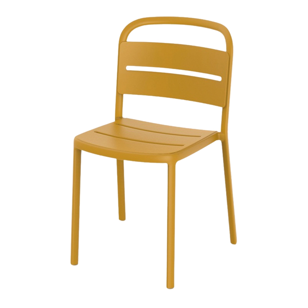 Stackable chair for indoors and outdoors. PP injected frame and seat. Protection against UV rays.